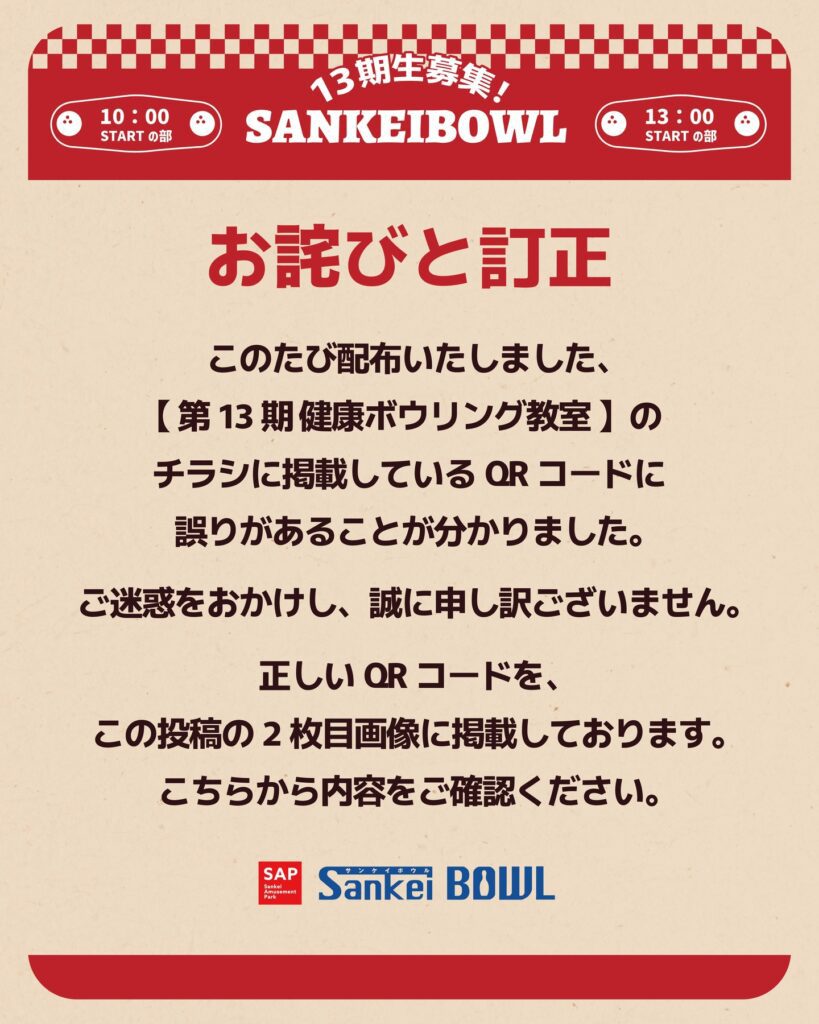このたび配布いたしました 【第13期 健康ボウリング教室】のチラシに掲載している QRコードに誤りがあることが分かりました。 ご迷惑をおかけし、誠に申し訳ございません。
