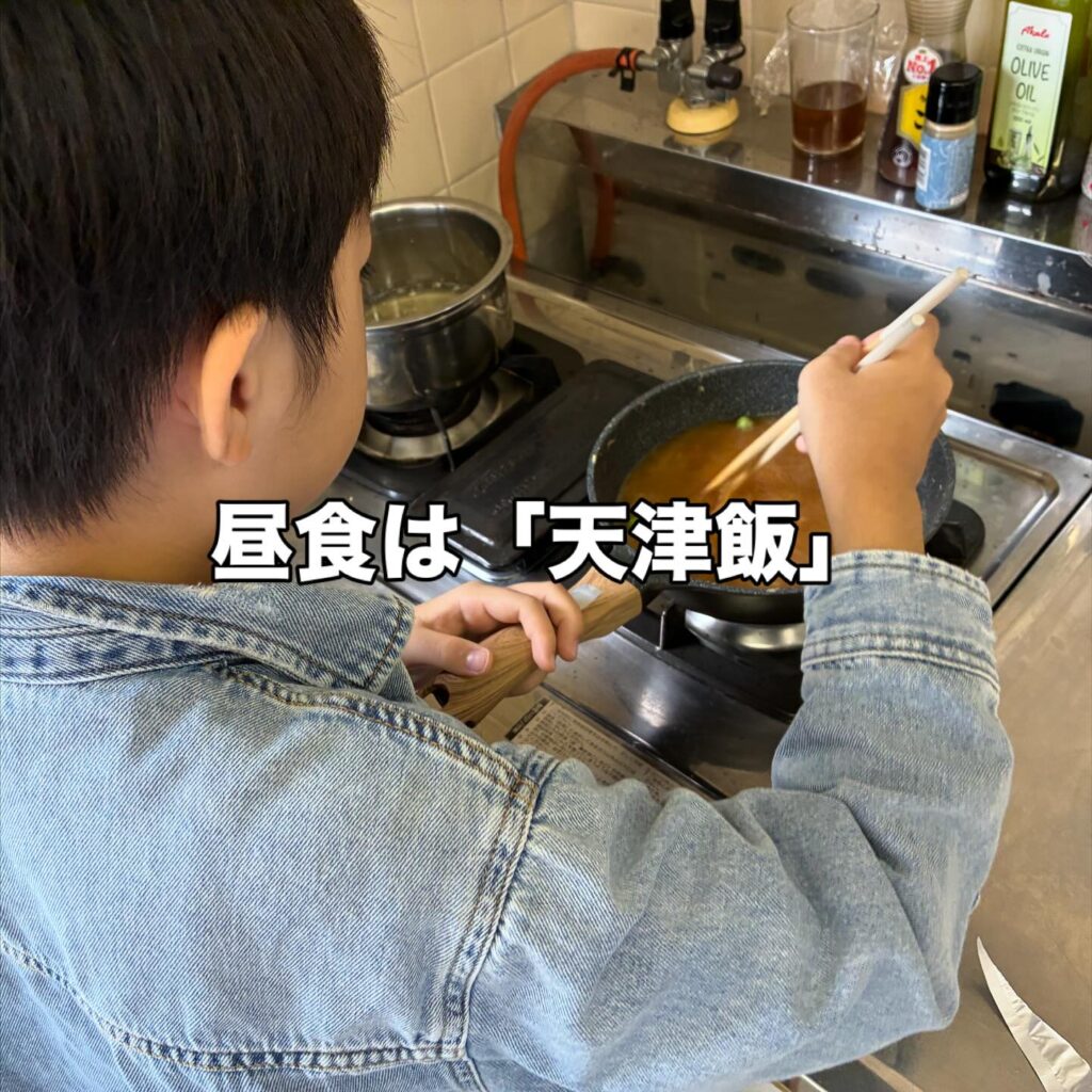その後、お昼ご飯は、昨日買ってあった卵とカニ玉の素を使って、天津飯とコンソメスープを。