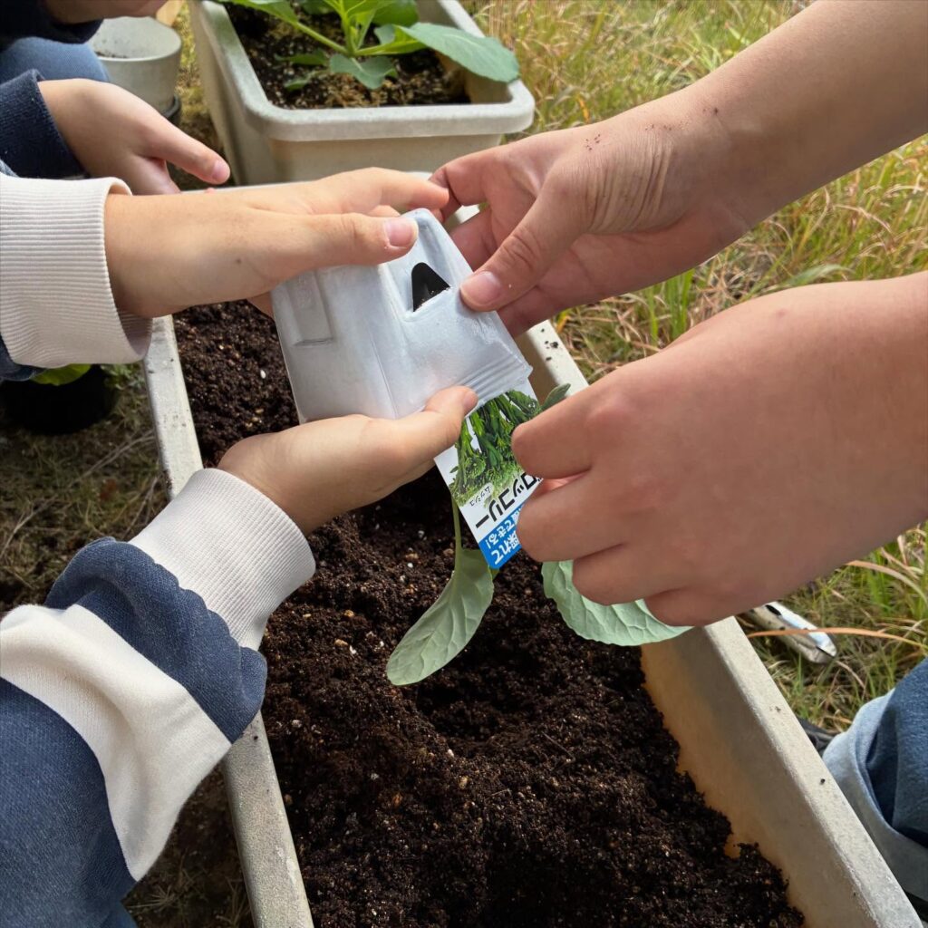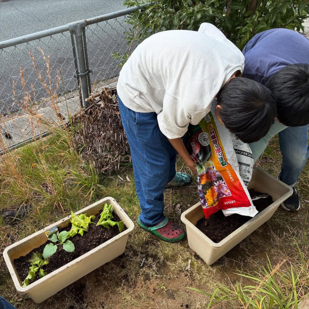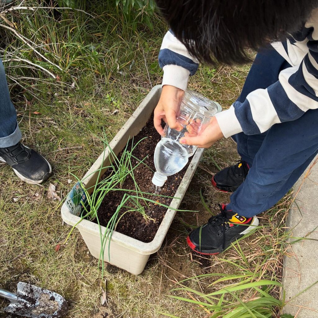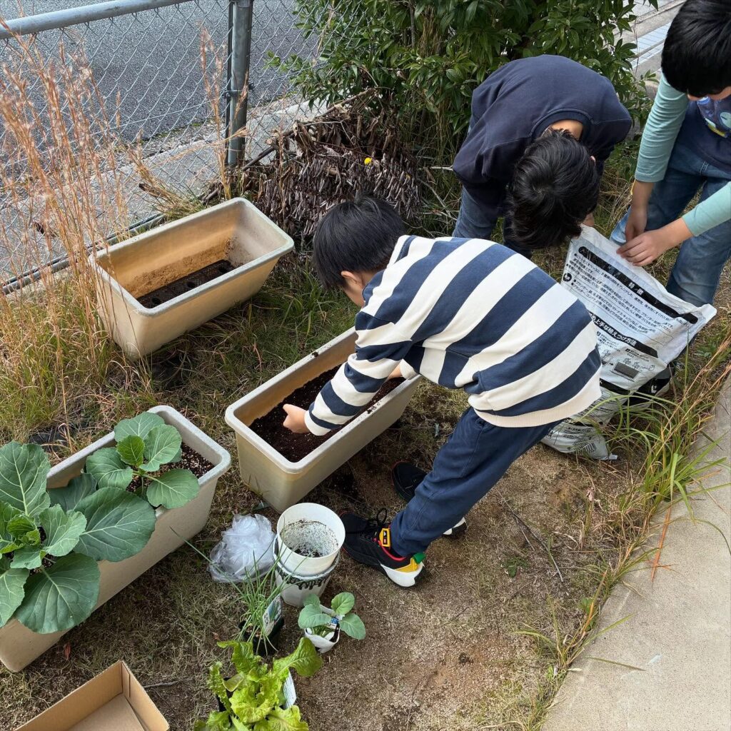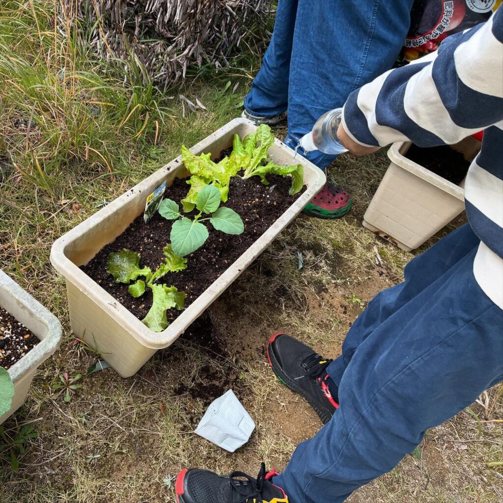 プランターに土を入れ、苗を植え、水をやり、もみ殻を撒きました!