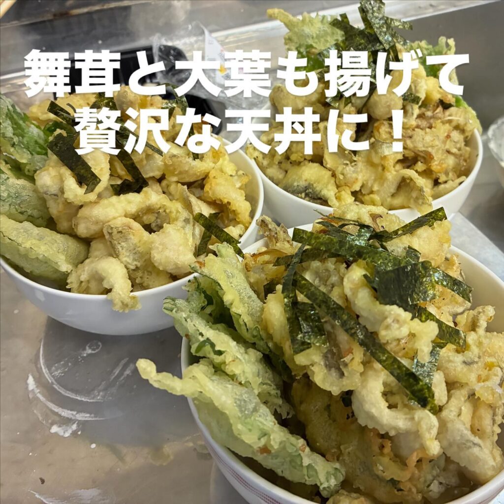 そうしておろしたアジを、天丼用に買って来た、舞茸と大葉と一緒に、揚げて