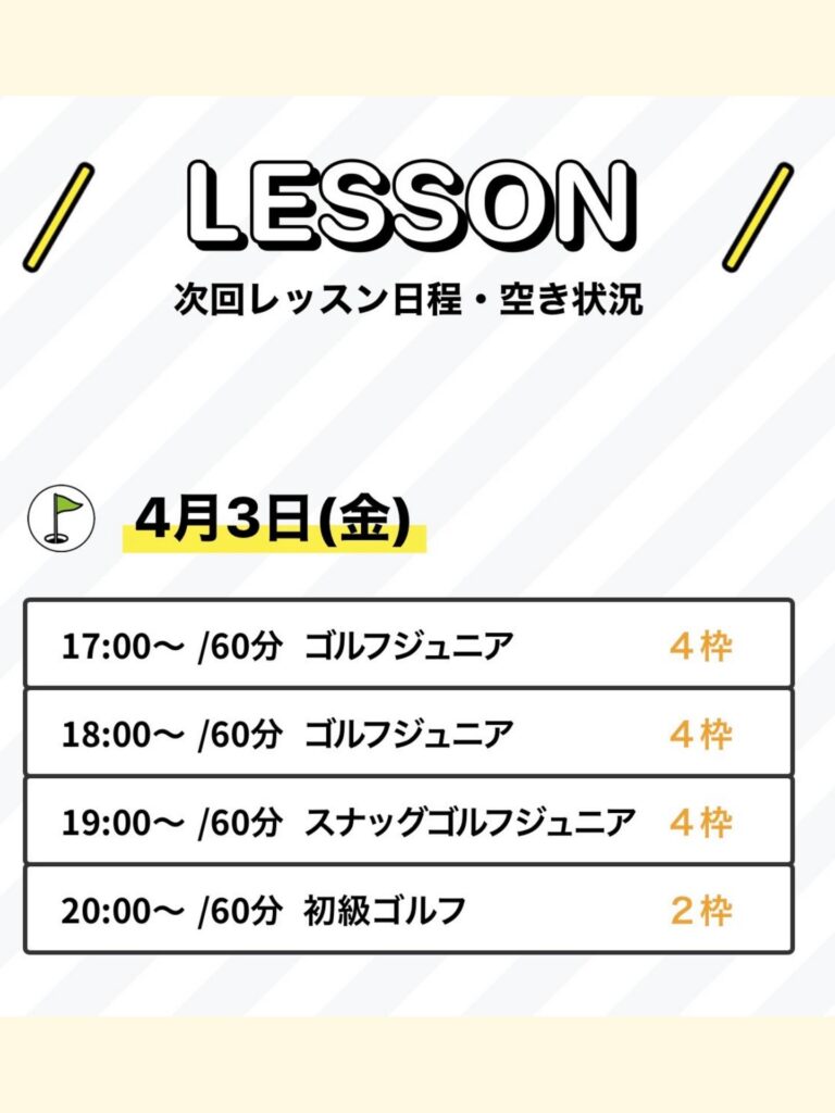 (※各20:00~の初級ゴルフは大人向けクラスです。